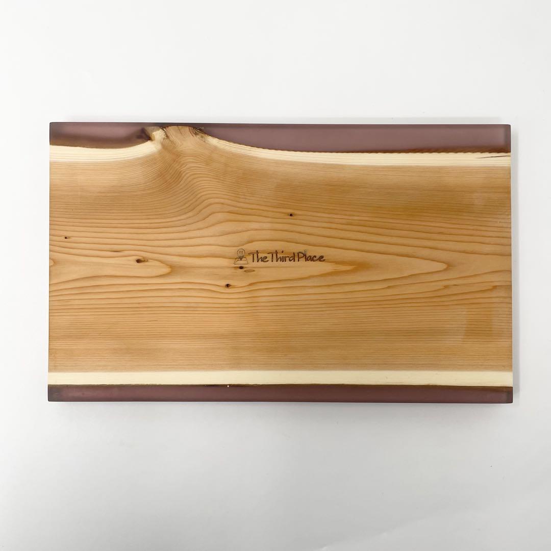 このプレートには、「イチイ」(漢字で書くと「一位」)の木材を使用しています。まさに一等賞を獲得したかのような風格を持つこの木材は、辺材が白、心材が赤褐色という美しい対比が特徴です。さらに、フローレンスレジンを組み合わせて制作し、表面にはレジントップコートで仕上げています。この加工により、水や汚れから木材をしっかりと保護。裏面は無塗装のまま木材本来のなめらかな質感をお楽しみいただけます。